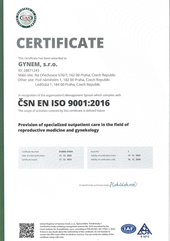 Oblasti regulative obuhvataju same ART procedure, laboratorijski prostor i materijale, dokumentaciju, pa čak i kvalitet vazduha. Takođe su na snazi posebni propisi za zaštitu donorki jajnih ćelija, primaoca i embriona. Kao dokaz poštovanja ovih strogih zahteva, naša klinika poseduje licencu Državnog instituta za kontrolu lekova (SÚKL), koji sprovodi redovne kontrole svake dve godine, a ujedno smo i nosioci ISO 9001 sertifikata, što potvrđuje da naši klinički, laboratorijski i upravljački procesi ispunjavaju međunarodno priznate standarde kvaliteta, doslednosti i kontinuiranog unapređenja.